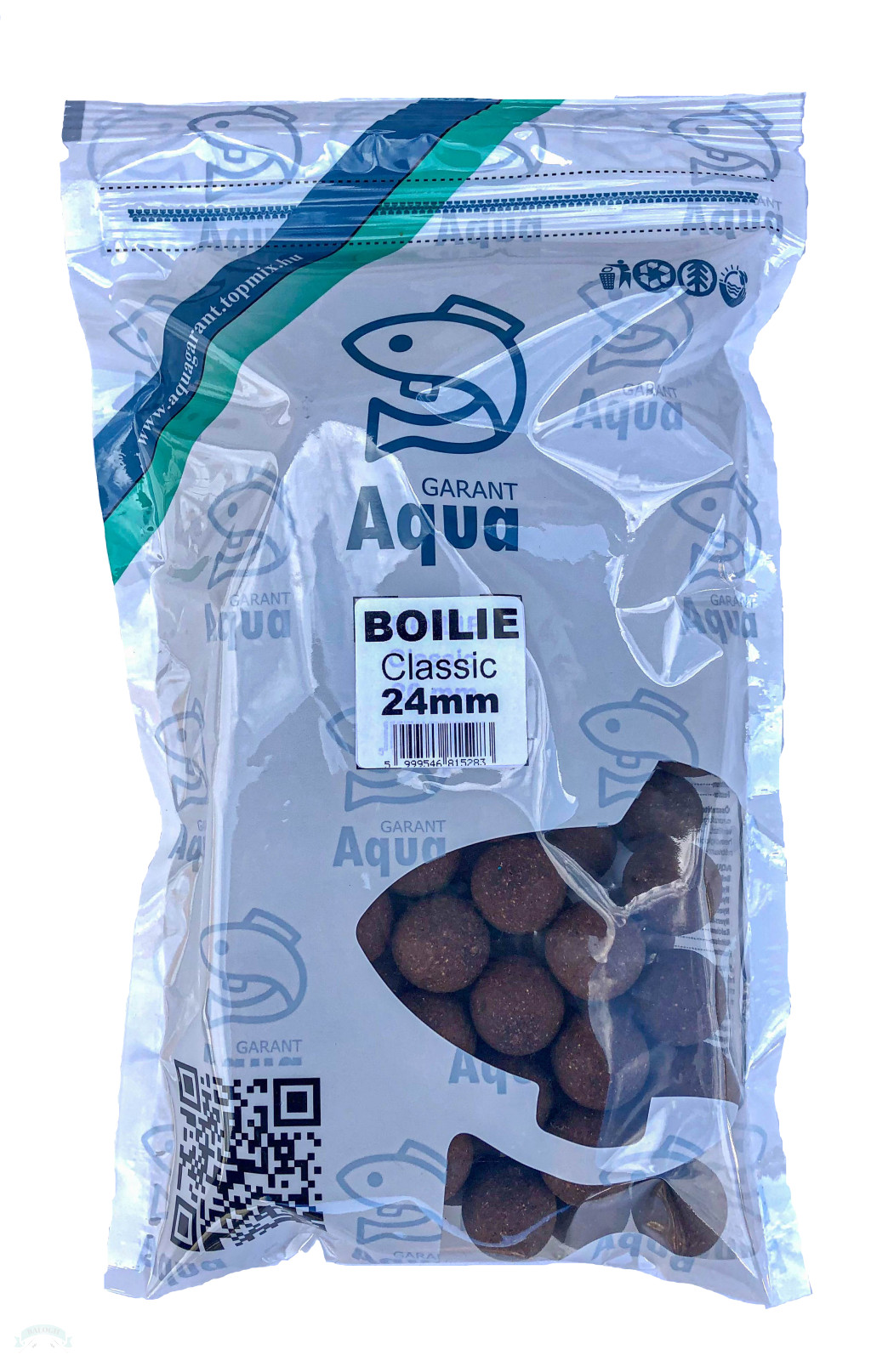 Aqua Boilie 20 és 24 mmKülönleges eljárással készült AQUA GARANT pelletek őrleményéből. Nyitott, oldódó bojli, melynek fehérje tartalma kimagasló 37%, ehhez kiegyensúlyozott fehérje és szénhidrát arány párosul. Különleges ponty csemege, melynek megalkotásánál a legfőbb szempont (csalogató ereje mellett) az emészthetőség, a halvédelem, így nélkülöztünk minden mesterséges aromát, tartósítószert és adalékot. Oldódási ideje 4-6 óra, de már egy perc után is látványos szemcse leválást mutat, az így kioldódó alapanyagok gyorsan fejtik ki csalogató hatásukat. A termék aromát nem tartalmaz!