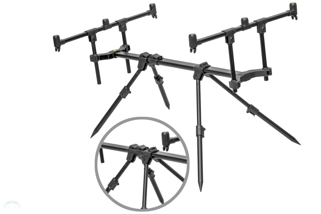 Exkluzív megjelenésű, prémium feketére porfestett alumínium rod pod, mely a környezeti viszonyokhoz igazodva kétféleképpen: a központban vagy a keresztmerevítő végein elhelyezett lábállással is használható. Három kompletten felszerelt bojlis bot tárolására alkalmas, a buzz-bar magassága állítható. A teleszkópos lábaknak köszönhetően magassága szabályozható. Az első és hátsó pár lábak központosan és egymástól eltolva, távoli állásban is használhatóak. Minden teleszkópos rész gyorsan oldható, masszív zárral lett ellátva, így gyorsan felállítható vagy szétszerelhető.