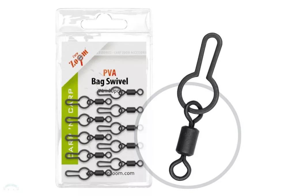 PVA tasakok szerelékhez történő rögzítésére szolgáló forgókapocs. A speciális kialakítású karika segítségével, biztonságosan és leesés mentesen rögzíthető a csomóval lezárt PVA tasak, illetve PVA háló.