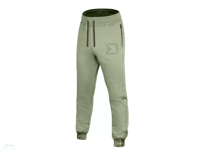 A LOGOS sorozat melegítőnadrágjai maximális kényelmet és stílust kölcsönöznek viselőjének horgászathoz, természetjáráshoz vagy városi sétákhoz. Zöld színű anyagból készülnek, amely rugalmas és kellemes tapintású, kivételes kényelmet biztosítva.A derékpánt rugalmas szalaggal és széles húzózsinórral van ellátva, amely lehetővé teszi a derékbőség igény szerinti beállítását. Mindkét oldalon tágas cipzáras zsebek, hátul pedig egy kisebb, tépőzáras zseb található.A melegítőnadrág alsó része elkeskenyedő, rugalmas mandzsettákkal, hogy szorosan illeszkedjen a bokához.A LOGOS jól átgondolt dizájnja kisebb "Delphin" feliratokat tartalmaz, amelyek érdekes mozaikot alkotnak a "D" logónk formájában.Anyagösszetétel: 60% poliészter, 40% pamut