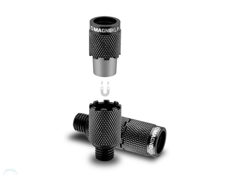 Egy innovatív csatlakozó, amelyet a Delphin kutatócsoportunk fejlesztett ki és tesztelt. A MagneKLIK belsejében egy extra erős mágnes és egy sor egymásba illeszkedő barázda található. A kapásjelző felső részéhez csavarozható, az alsó rész pedig a leszúróra vagy kereszttartóra rögzíthető. A kettő könnyedén összekapcsolható a mágnes egy „kattanásával”, és a szett készen is áll a használatra. A horgászat után egyszerűen válassza le a gyorskioldó adaptert egyetlen mozdulattal, és tegye félre a szállításhoz. Így nem kell minden alkalommal felcsavarnia a kapásjelzőt, hiszen azonnal használatra kész!A test CNC bevonattal rendelkező fémből készült, a nagyobb tartósság érdekében. A belső mágnes és a barázdák tökéletesen illeszkednek egymáshoz és összekapcsolódnak, holtjáték és csavarodás nélkül. Elegendő barázdával rendelkezik a kapásjelző kívánt helyzetének beállításához, és biztos lehet benne, hogy nem fog elfordulni, ahogy ez a golyóscsapágyas modelleknél gyakran előfordul.A MagneKLIK szabvány menettel rendelkezik, amely a piacon kapható kapásjelzők többségéhez használható. Mindkét szál kompatibilis az összes kereszttartóval vagy leszúróval.Technikai információ:Külső méretek: 15mmMagassága: 43mm