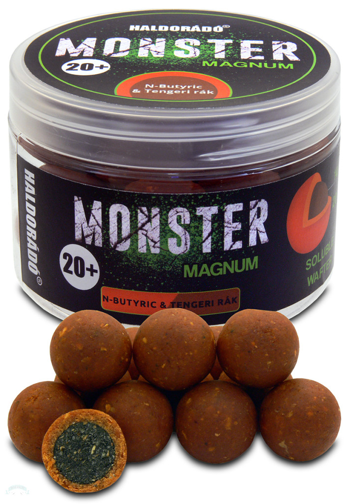 A MONSTER Magnum az oldódó és a főzött csalik összes előnyével rendelkezik, ugyanis olyan csaliról van szó, amelynek közepe főzött, külső rétege viszont oldódó! Belső magja 14 mm átmérőjű, parafaőrleménnyel balanszírozott, főtt, nem oldódó csali. A külső réteg 3 mm vastag és folyamatosan oldódva ontja magából a csábító ízanyagokat. Használatával elkerülhetjük csalink leázását, ugyanis a belső, főzött rész, akár 72 órát is kibír, miközben a külső rész oldódási ideje 2-3 óra (vízhőfoktól függően).