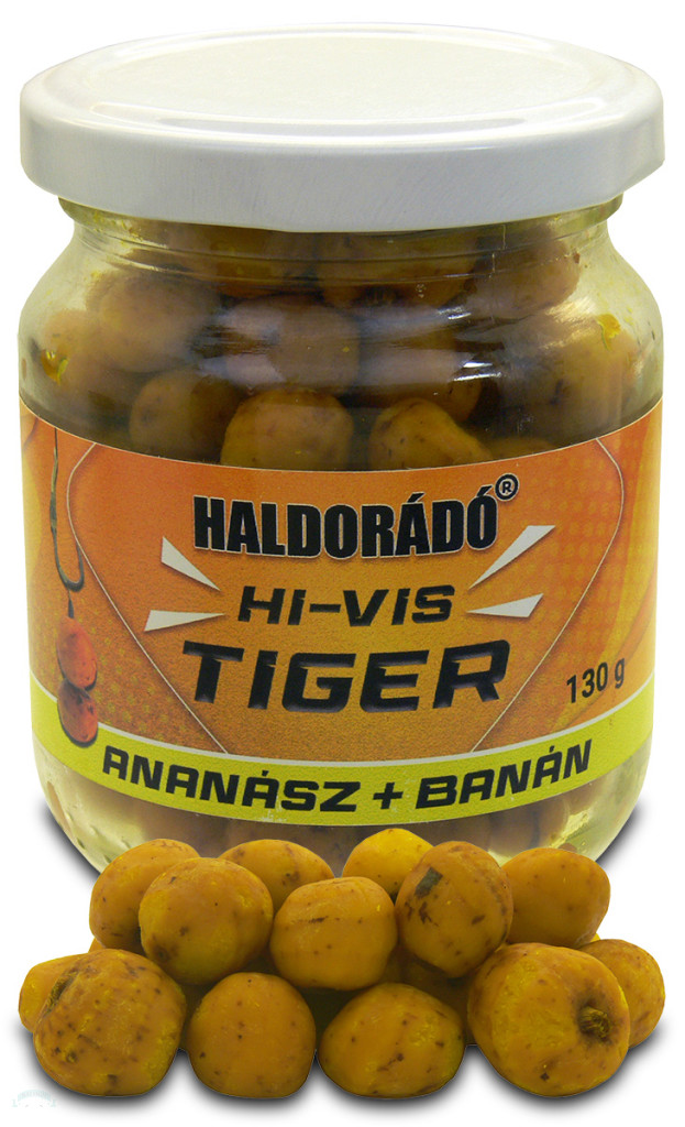 Ez a csalizó tigrismogyoró nemcsak rendkívül intenzív ízével és aromájával, hanem High Visual, azaz magas vizuális ingerrel, vagy másként tökéletes láthatóságával is kitűnik a mederfenéken vagy az etetési szőnyegen. Egy forradalmian új technológiával sikerült úgy ízesíteni és színezni a szemeket, hogy azok akár napok múlva is ontják magukból a csábító, finom aromát. Ha a szemeket kettétörjük, akkor válik láthatóvá, hogy teljes keresztmetszetében (nem csak a külső felületén) vannak színezve és ízesítve. Nagyon fogós természetes csali, amely bárhol bevethető, legyen szó ponty, vagy amur horgászatáról.A Hi-Vis Tiger négyféle szín- és ízválasztékban érhető el: az Ananász + Banán sárga színű, a Nagy Ponty bordó, a Mangó narancssárga, míg a Kiwi zöld színű.