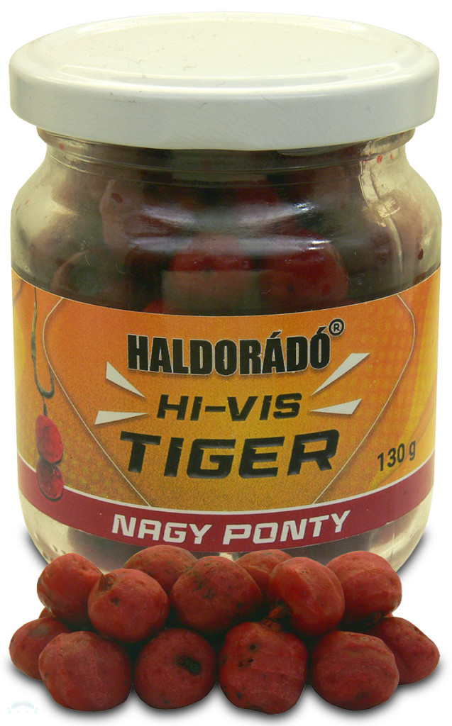Ez a csalizó tigrismogyoró nemcsak rendkívül intenzív ízével és aromájával, hanem High Visual, azaz magas vizuális ingerrel, vagy másként tökéletes láthatóságával is kitűnik a mederfenéken vagy az etetési szőnyegen. Egy forradalmian új technológiával sikerült úgy ízesíteni és színezni a szemeket, hogy azok akár napok múlva is ontják magukból a csábító, finom aromát. Ha a szemeket kettétörjük, akkor válik láthatóvá, hogy teljes keresztmetszetében (nem csak a külső felületén) vannak színezve és ízesítve. Nagyon fogós természetes csali, amely bárhol bevethető, legyen szó ponty, vagy amur horgászatáról.A Hi-Vis Tiger négyféle szín- és ízválasztékban érhető el: az Ananász + Banán sárga színű, a Nagy Ponty bordó, a Mangó narancssárga, míg a Kiwi zöld színű.