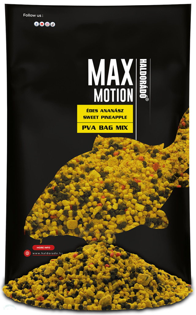 A modern pontyhorgászat elképzelhetetlen PVA Bag-es módszer nélkül. Ez a technika nem csak a bojlis módszert kedvelők közt népszerű, de egyre többen használják hagyományos, rapid fenekező horgászatok során. Eredményessége megkérdőjelezhetetlen, ugyanis ezzel a módszerrel a csali az etetőanyag kupac kellős közepén helyezkedik el, csak úgy, mint a method módszer során.2025-től a MAX MOTION termékcsoportunkat egy nagyon alaposan és szisztematikusan összerakott PVA Bag Mix családdal is bővítjük. Ezek a vegyes szemcseméretű keverékek csak olyan őrleményekből, micropelletekből és tört bojlikból állnak, melyek szárazon is garantáltan süllyednek. A PVA bag-es módszerrel történő bevetés mellett ezek a keverékek alkalmasak a nagy pontyos etetőanyagok dúsítására is!Hét különböző változatban érhetők el a kínálatban. Ezek a Champion Corn, Spanyol Mogyoró, Kókusz & Tigrismogyoró, Édes Ananász, Nagy Hal, Fűszeres Vörös Máj, valamint a Juhar & Banán.