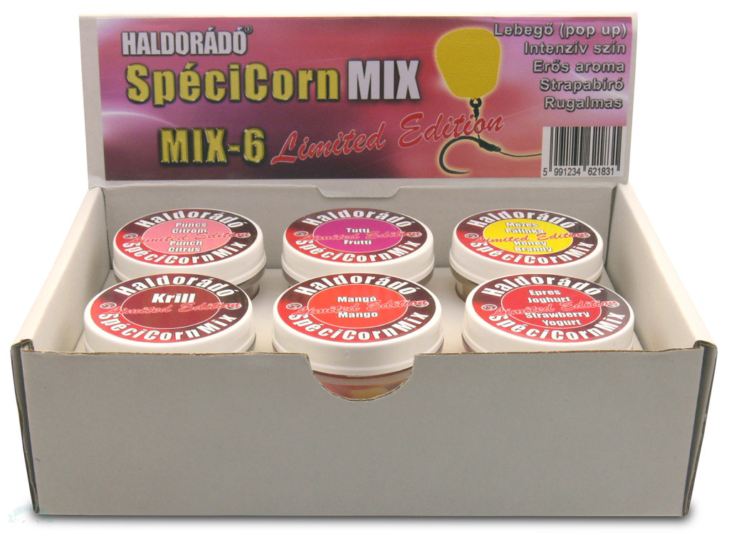 A Haldorádó SpéciCorn termékcsalád már jó ideje meghatározó a magyar piacon. A legtöbb hazai pontyhorgásznak szinte biztos, hogy ott lapul ezek közül 1-2, vagy akár több tégely is a táskájában. Az évek alatt bebizonyították ezek a csalik, hogy sokkal többek, mint egy darabka műanyag. Főként vadvizeken törpeharcsáktól és egyéb zavaró apró halaktól hemzsegő vizekben mutatják meg igazi fogósságukat, kiválogatva az értékes halakat!Az évek során több új csaliváltozattal bővült a palettánk, de a legnépszerűbb mindmáig a SpéciCorn, és a SpéciCorn Mega, azaz a normál és nagyméretű gumikukoricák. A nyerő ízekről és színekről azonban megoszlik a felhasználóink véleménye. Nagyon sok ötletet, javaslatot kaptunk, amelyből nekünk „csak” ki kellett választani a várható legjobbakat. Ezt követték a tesztek és próbahorgászatok sorozatai, majd végül ez a 6 változat maradt:- Epres Joghurt (citromsárga + piros)- Tutti Frutti (citromsárga + pink)- Puncs Citrom (citromsárga + pink)- Mangó (citromsárga + narancssárga)- Mézes Pálinka (citromsárga + narancssárga)- Krill (citromsárga + barna)Nagyon fontos, hogy mindegyikben megtalálható alapszín a citromsárga, amely mellé került egy általunk fogósnak vélt szín. Az is folyamatos vita forrása, hogy melyik a jó méret? A kicsi vagy a Mega? Nem tudtuk eldönteni, ezért tettünk mindkettőből a tégelyekbe. Így a csali méretét is a halak kapókedvéhez lehet igazítani, a színek tetszőleges variálásával együtt. Egy tégelyben nem 10, hanem 16 kukoricaszem található. Ezek közül 8 db normál méretű SpéciCorn, 8 db pedig a megnövelt méretű SpéciCorn Mega.