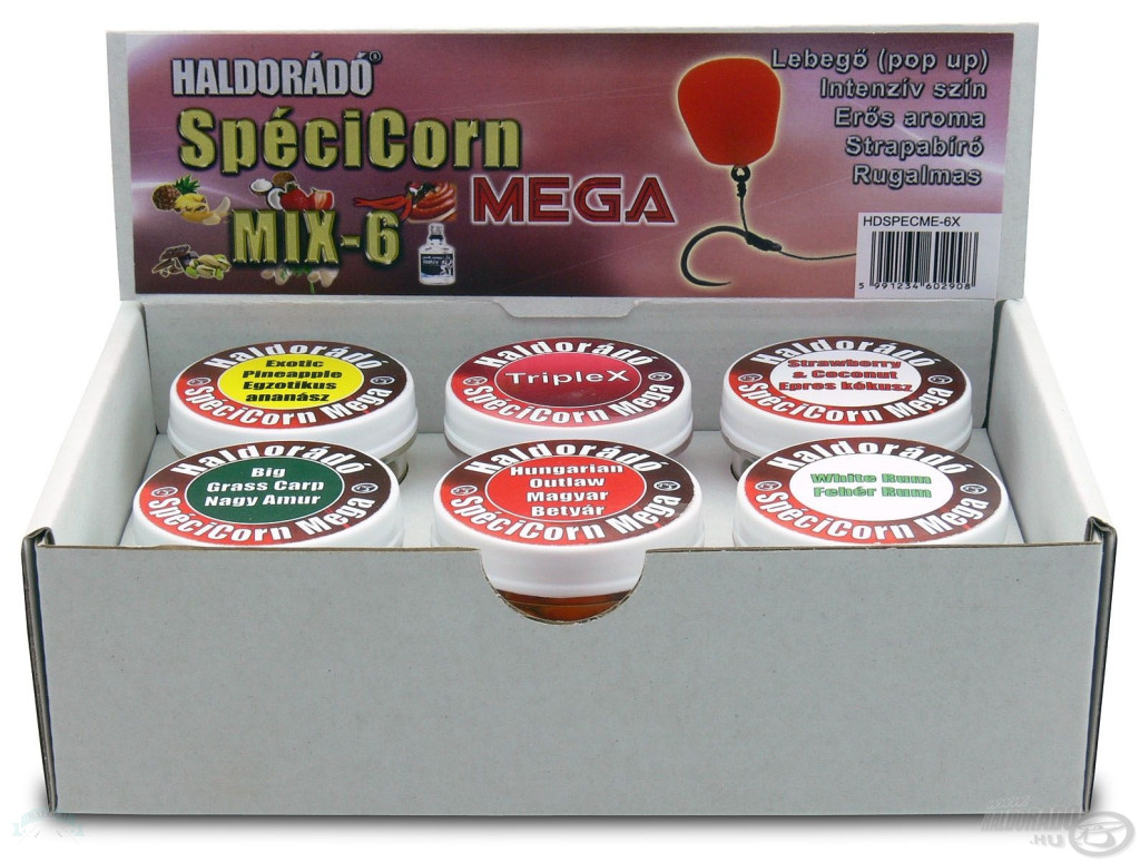 A SpéciCorn Mega nem más, mint nagyméretű ízes, színes, lebegő gumikukorica. Ezek a rugalmas, nagyméretű csalik minden helyzetben megállják a helyüket! Ellenállnak a legmohóbb apróhalaknak is, még a törpeharcsa sem képes „leoperálni” a hajszálelőkéről. Ellenállóságukkal időt nyerünk, és biztosak lehetünk abban, hogy csábító aromáját előbb, vagy utóbb a közelben úszkáló nagytestű halak is megérzik! A SpéciCorn Mega nevében is jelzi méretét, amely a hagyományos gumikukoricánk háromszorosa. Minden tégelybe minimum két különböző színváltozat került. A sárga színű „alap csali” nem hiányozhat egyik ízesítésnél sem, amit kiegészítettünk különleges, az adott aromával harmonizáló fluo színű gumikukoricákkal. Hat különleges ízben kerül forgalomba, ezek: Magyar Betyár/Hungarian Outlaw, Egzotikus Ananász/Exotic Pineapple, Nagy Amur/Big Grass Carp, Epres Kókusz/Strawberry&Coconut, Fehér Rum/White Rum, TripleXA 6-os gyűjtődobozban az összes íz helyet kapott, így minden időszakban tudunk alkalmazkodni az adott helyzethez, illetve a halak aktuális ízléséhez.