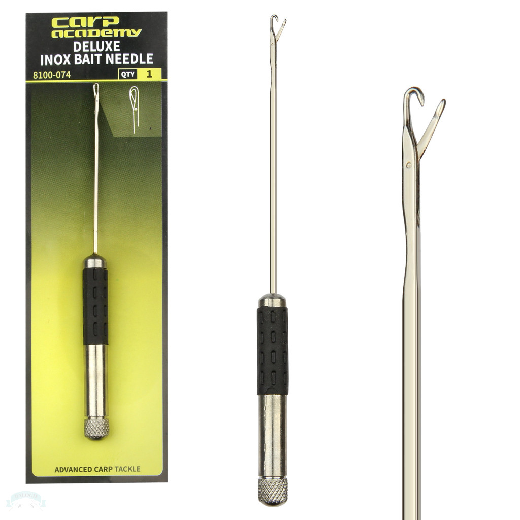 Saválló markolatú fűzőtű, a csalik hajszálelőkén történő felkinálásához.