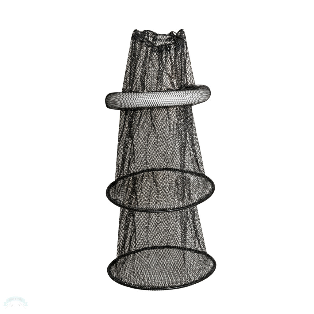 A háló anyaga erősített és gumírozott kivitelű hálószövet 7x10 mm-es lyukbőséggel, plusz a merevséget adó keret is fém betéteket kapott, a tetején lévő akasztó alatt pedig egy szivacsos lebegtető lett beillesztve, így csónakos és parti horgászatoknál is tökéletes alkalmatosság lesz, könnyen kivehetőek belőle a csalizásra szánt halak.