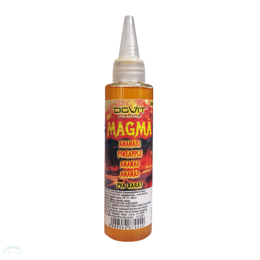 A Magma előnyei:- PVA barát.- Sűrű állag.- Markáns aromák.- Mederfenéken terjed.Használd ki a sűrűségben rejlő lehetőségeket!- A Magma annyira sűrű, hogy bármilyen mély vízben veted be, az biztosan le fog érni a mederfenékre.- Kosárra kenve nagy biztonsággal kínálhatod fel a legmélyebb tavakban is.Extra aromák!- Mindegyik Magma nagyon intenzív ízesítést kapott, jelenlétüket a pontyok messziről megérzik.Magas energia tartalom!- A Magma nagy mennyiségben tartalmaz szénhidrátokat, amit a pontyok nem tudnak figyelmen kívül hagyni.- A markáns ízesítésű, édeskés sziruppal kezelt kosarad biztosan nem fog kapás nélkül maradni.Télen-nyáron!- Magmát nyáron is sikeresen használhatsz, de a leghidegebb hónapokban is eredményes, hiszen sűrűsége miatt a mederfenéken terjed a legjobban, ahol a pontyok télen tartózkodnak.PVA barát!- Magmát nem csak method feederezéshez, hanem szelektív pontyhorgászathoz is eredményesen használhatsz, hiszen PVA barát, ezáltal stick mixeket készíthetsz, vagy PVA tasakban is felkínálhatod.A Magma egy olyan rendkívül sűrű, PVA barát aroma, ami leginkább a mederfenéken fejti ki csalogató hatását. Teljes mértékben négy évszakos, és a method feederezésen túl, a szelektív pontyhorgászatban is eredményesen tudod alkalmazni. Kosárra kenve nagy távolságokba dobható, de PVA tasakban is sikeresen tudod bevetni. Kiszerelés: 100g/flakon
