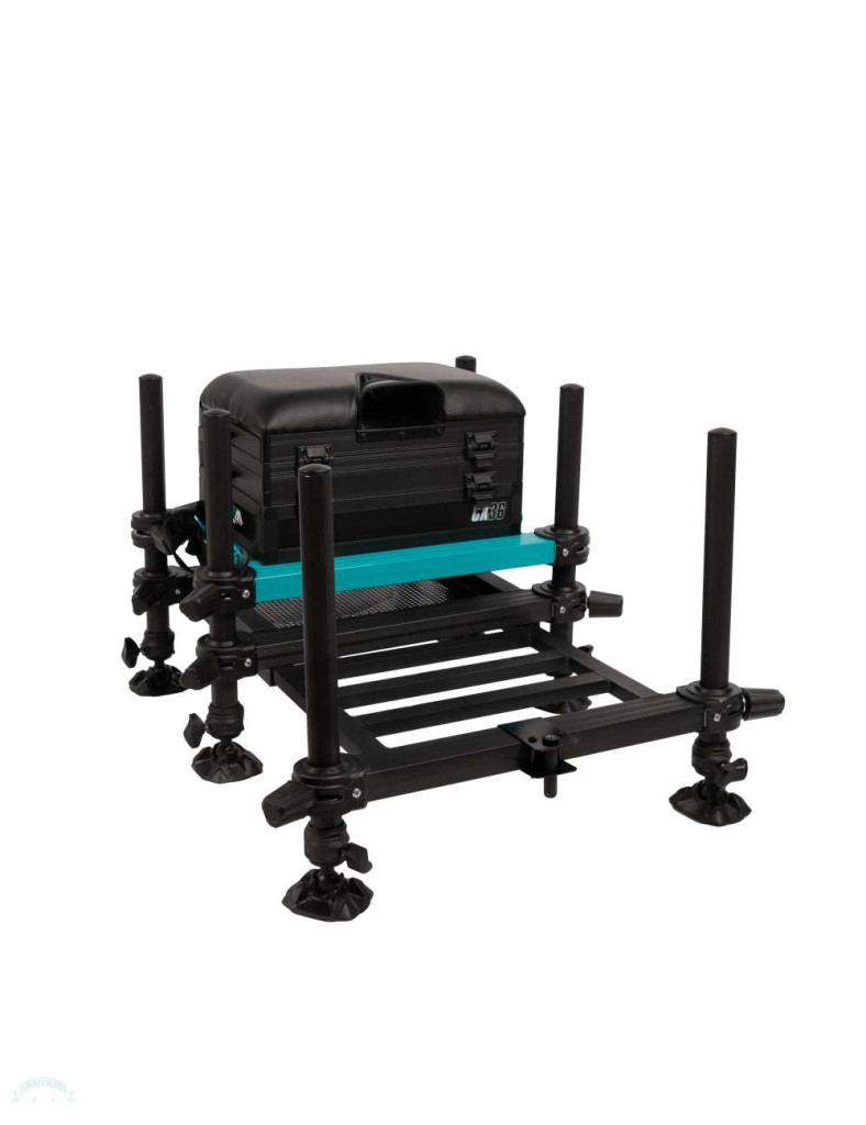 A CX36 láda egy hihetetlenül kompakt és stabil, nagy teljesítményű "kosár", hat állítható lábbal, amelyek átmérője 10cm, 36mm. Oldalsó fiókokkal, lábakban lévő mentekkel, hálótartóval, vízmértékkel és központi rögzítéssel van felszerelve a keret hátsó részén egy további polc van.Kényelmes, párnázott ülés a horgászok számára. Állítható ülésmagasság, modern kompakt kialakítás, amely lehetővé teszi a versenyláda két konfigurációban történő használatát. Alumínium, könnyű, korróziógátló, állítható váz.