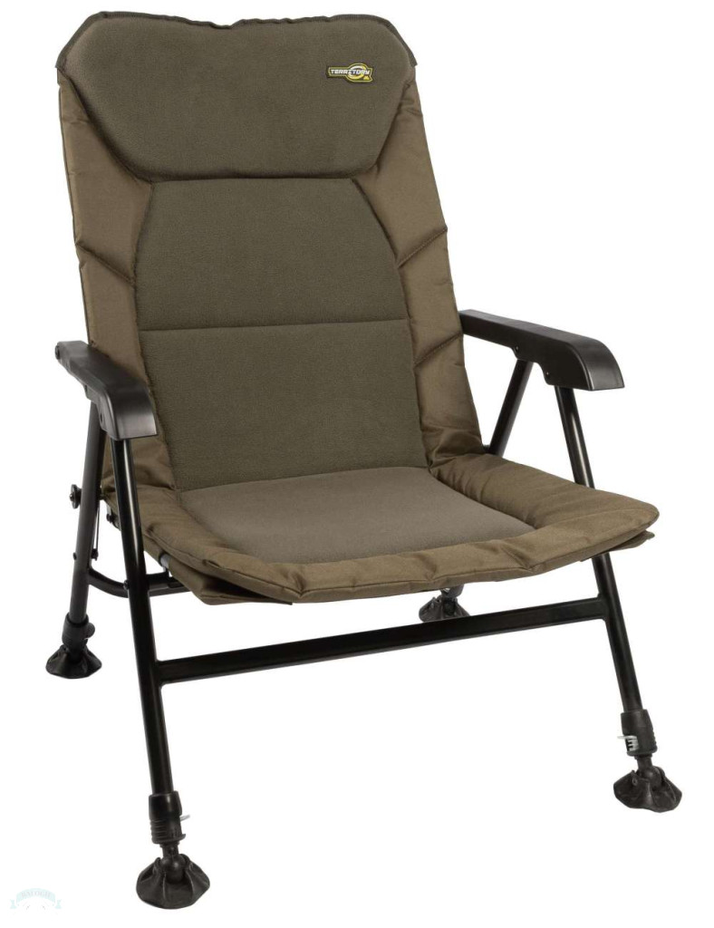 Klasszikus fotel állítható lábakkal és kényelmes, merev háttámlával.