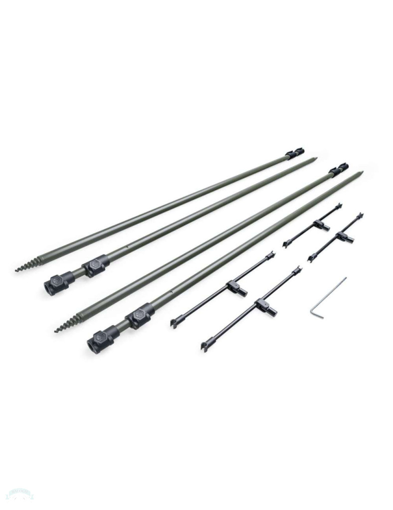 Szett tartalma:4 db teleszkópos becsavarozható viharoszlop4 db saroktávtartó rúd1 db csap a rúd könnyű talajba fúrásáhozHajtogatott teleszkópos rúd hossza: 115 cmFelső rész hossza: 108 cmAlsó rész hossza (csavaros heggyel): 108 cmTávtartó sarokrúd hossza: 32 cm