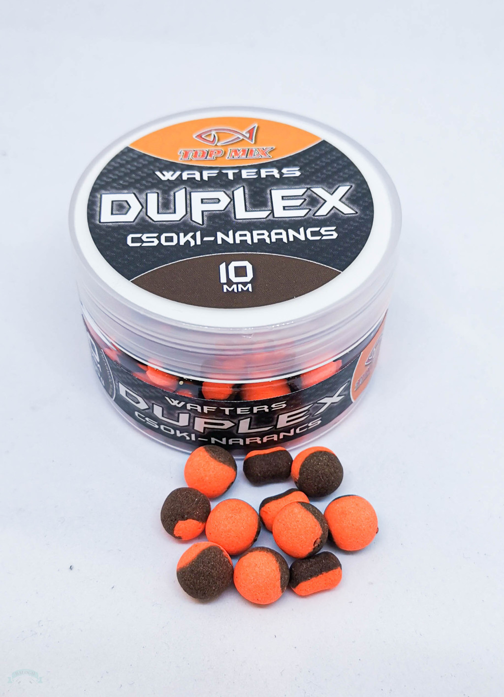 A Top Mix Duplex wafters termékcsalád tagjai azoknak a feeder horgászoknak készültek, akik szeretik az attraktív oldódó csalikat. Kikönnyített pelletek, de épp csak annyira, hogy fine tüske mellett #14 horgokkal is használhatók legyenek a legkisebb, 8-as méretek. 8mm, 10mm és 12mm méretekben kapható minden íz. Oldódási képessége intenzív, "nyitott csali", hogy az aroma mellett beltartalmi értéke is csalogassa az oda tévedő halakat. Dupla színösszeállítás mellett ugyanazzal a csalival különböző fényviszonyok mellett is horgászhatunk, egyszerűen a másik oldalról tűzzük fel a csalinkat, máris más tónusú, de ugyanolyan színvilágú csalink lesz a horog mellett.