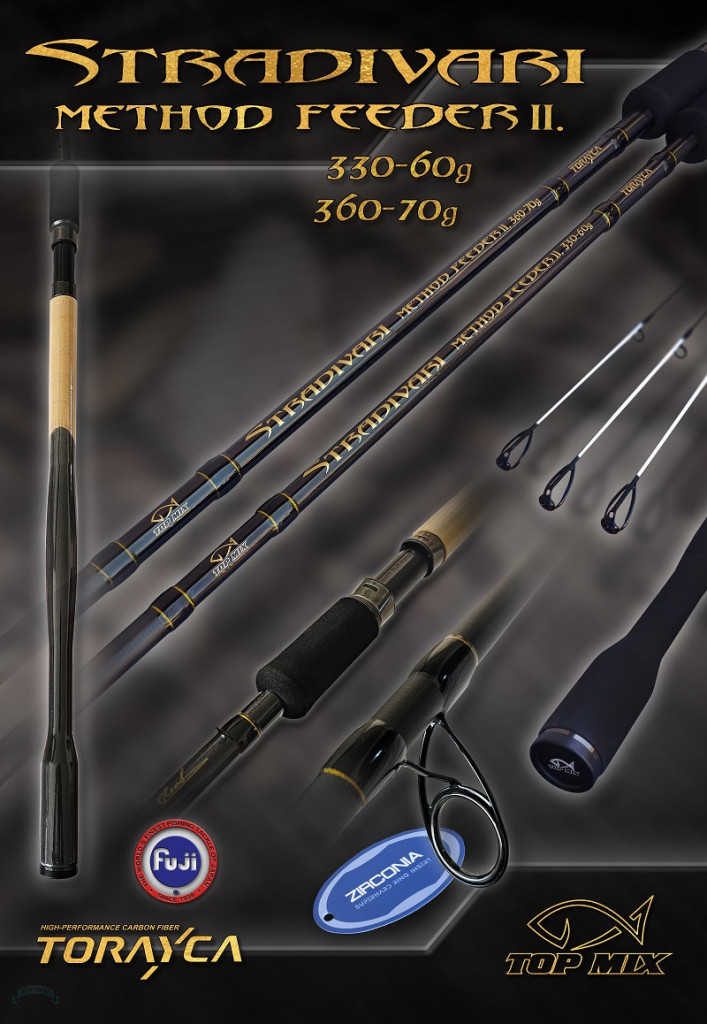 Top Mix Stradivari Method Feeder II 330 60gA tovább fejlesztett Stradivari method feeder II botok az elődjeikhez képest nagy különbséget nem mutatnak, mégis pár apró részletben magasabb minőséget képviselnek. A botok anyaga magas minőségű 40T carbon lett. Változott a nyélkialakítás formája is, ergonomikusabb lett. A felhasznált anyag kiváló tulajdonságai teszik a botot könnyűvé, feszessé és nagyon kezessé. A botok kialakításánál nagy figyelmet fordítottunk arra, hogy élmény legyen vele a horgászat, minimálisra csökkenjen a halvesztés lehetősége. A botoknak van „elejük” a fárasztáshoz, megfelelően erős gerincük a pontos és a hosszabbaknál a nagy távolságú dobásokhoz. Kategóriájukban a legkönnyebbek közé tartoznak, így kényelmessé teszik a horgászatot. A legfinomabb 3,30 és 3,60-as botok egytalpas emelt, míg az erősebb 3,90 és 4,20-as kéttalpas, a mai elvárásnak megfelelő magas minőségű SeaGuide Zirconia gyűrűkkel szereltek. A botok felülete „nyerscarbon” , míg a feliratok alatt fényes lakk kiképzést kapott. A nyél hossza kényelmes botkezelést, míg anyaguk, EVA és parafa kombinációja, kellemes fogást biztosít. A nyélen természetesen horogakasztó is található. A spiccek hármas támaszú spiccgyűrűket kaptak, így nem hajolnak el és dobáskor is kisebb lesz a felcsavarodás, ezzel együtt pedig a spicctörés lehetősége. Egyéb tulajdonságok:Tagok száma: 3+3Spiccek: 1 - 2 - 3 OZ Terhelhetőség: 60gSzállítási hossz: 117 cmSúly: 180 grNyéltag átmérő: 10,8 mm