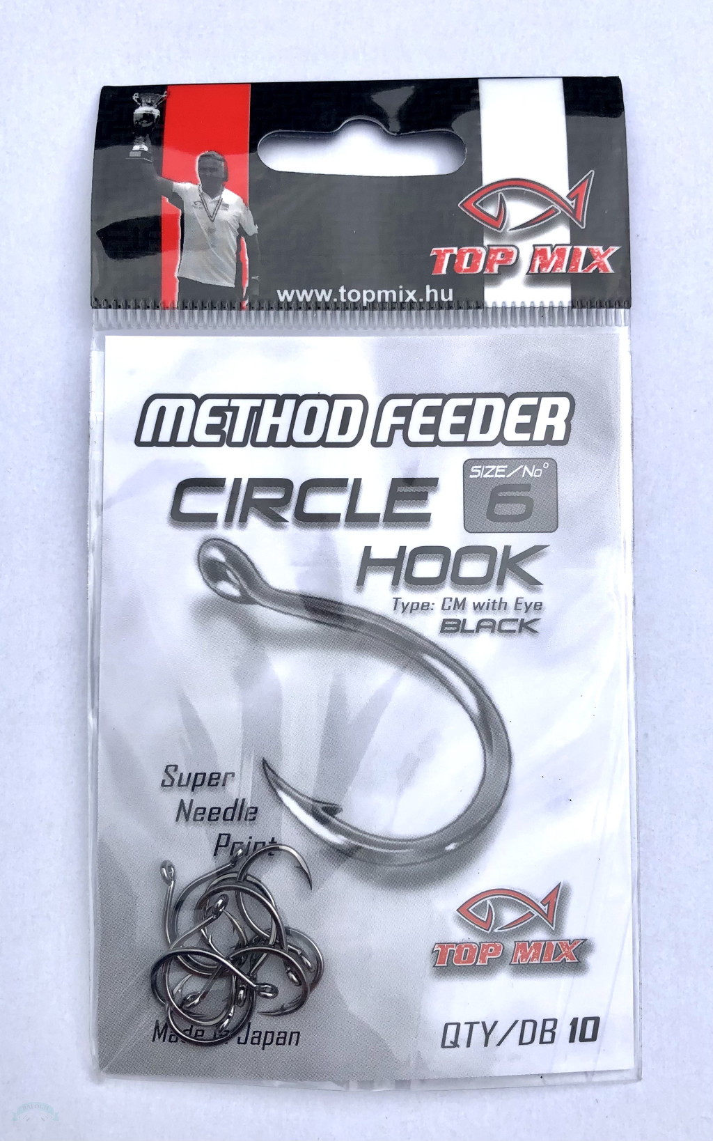 Japánban gyártott, csaknem köríves a method feeder horgászok körében igen kedvelt horog típus. Nagyöblű, csapott horoghegyű, rövid szárú, kiváló éltartó tulajdonságú, kémiai élezésű mikroszakállas, black nickel felületű füles horog. Elsősorban csalitüskés, vagy fűzött csalikhoz ajánljuk, legyen az pellet, wafters, bojli, vagy akár magvak.