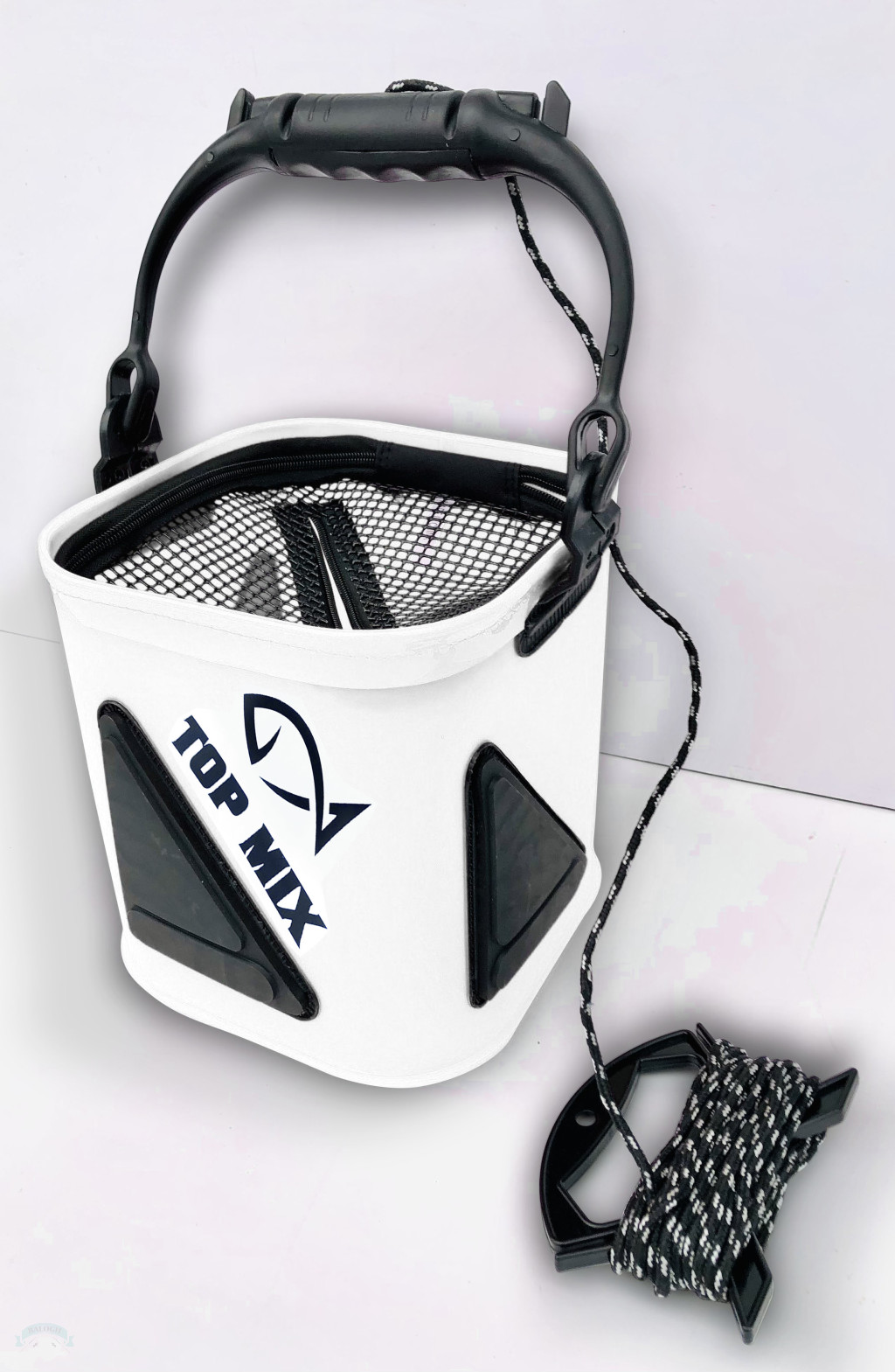 Praktikus vízmerítő, ha a leszakadt part vagy a magas stég miatt nem tudunk kényelmesen vizet meríteni a horgászathoz. 5m hosszú kötelének hossza a fogantyú peremeivel szabályozható. Összehajtható, így kis helyen elfér. Belső részén cipzáros hálóval ellátott, megakadályozza, hogy a vízből falevelek vagy egyéb hulladék kerüljön a tároló felületbe. Pergető horgászok számára csalihal tárolására is szolgálhat.