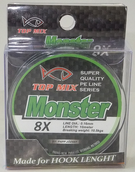 Magas minőségű, 8 szálból font, tökéletesen kőrszövött felsőkategóriás fonott előkezsinór család. Nagyteljesítményű, a 8 szálnak köszönhetően teljes hosszában tökéletesen kör keresztmetszetű a zsinór. Kód átmérő szakítószilárdság kiszerelés 740 0,08mm 5,5kg 10m 741 0,10mm 5,9kg 10m 742 0,12mm 8,2kg 10m 743 0,14mm 9,5kg 10m 744 0,16mm 10,5kg 10m 745 0,18mm 13,2kg 10m