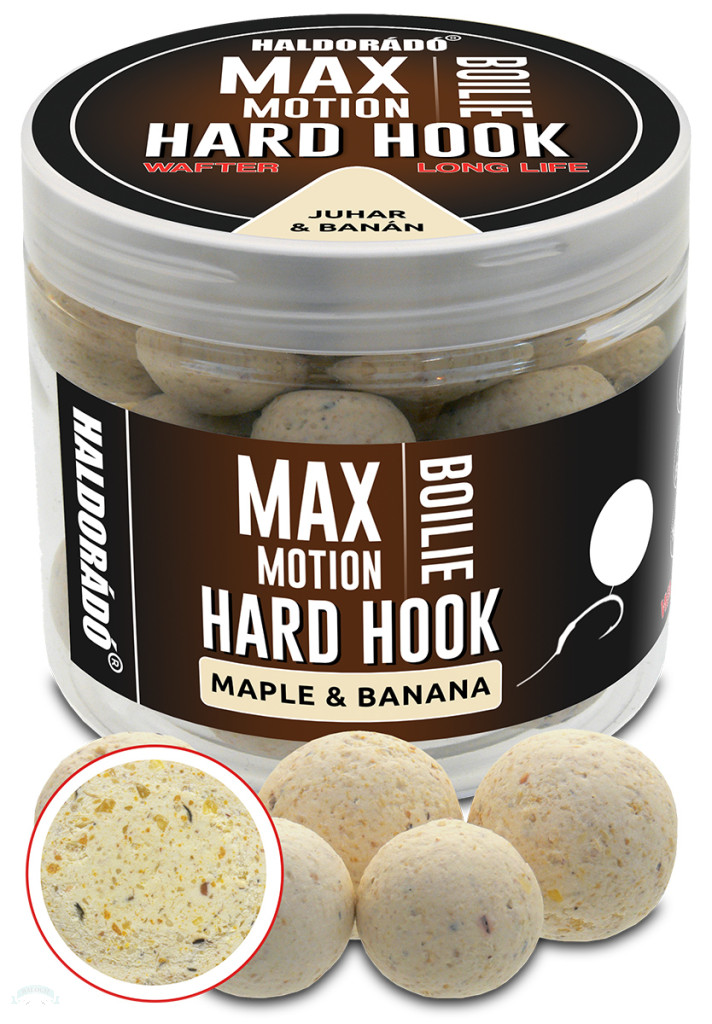 A MAX MOTION Boilie Hard Hook Wafter olyan könnyített, speciális eljárással készült kemény csali, amely egyértelműen azt a célt szolgálja, hogy hosszabb ideig is ellenálljon a zavaró fehérhalak, vagy akár a törpeharcsák támadásának. Keménységét hosszú ideig megőrzi, miközben aromakibocsátása lendületes, így biztosítva figyelemfelkeltő tulajdonságát.Kétféle kiszerelésben található meg a termékcsaládon belül. Az egyik 16 és 20 mm-es, míg a másik 24 és 30 mm-es golyókat tartalmaz. Ennek köszönhetően minden helyzetben lehet a zavaró halak, és a megfogni kívánt halak méretéhez is igazodni.Hétféle változatban érhető el a kínálatban. Ezek a Champion Corn (sárga), Spanyol Mogyoró (világosbarna), Kókusz & Tigrismogyoró (fehér + barna), Édes Ananász (sárga), Nagy Hal (piros), Fűszeres Vörös Máj (bordó) és a Juhar & Banán (fehér).